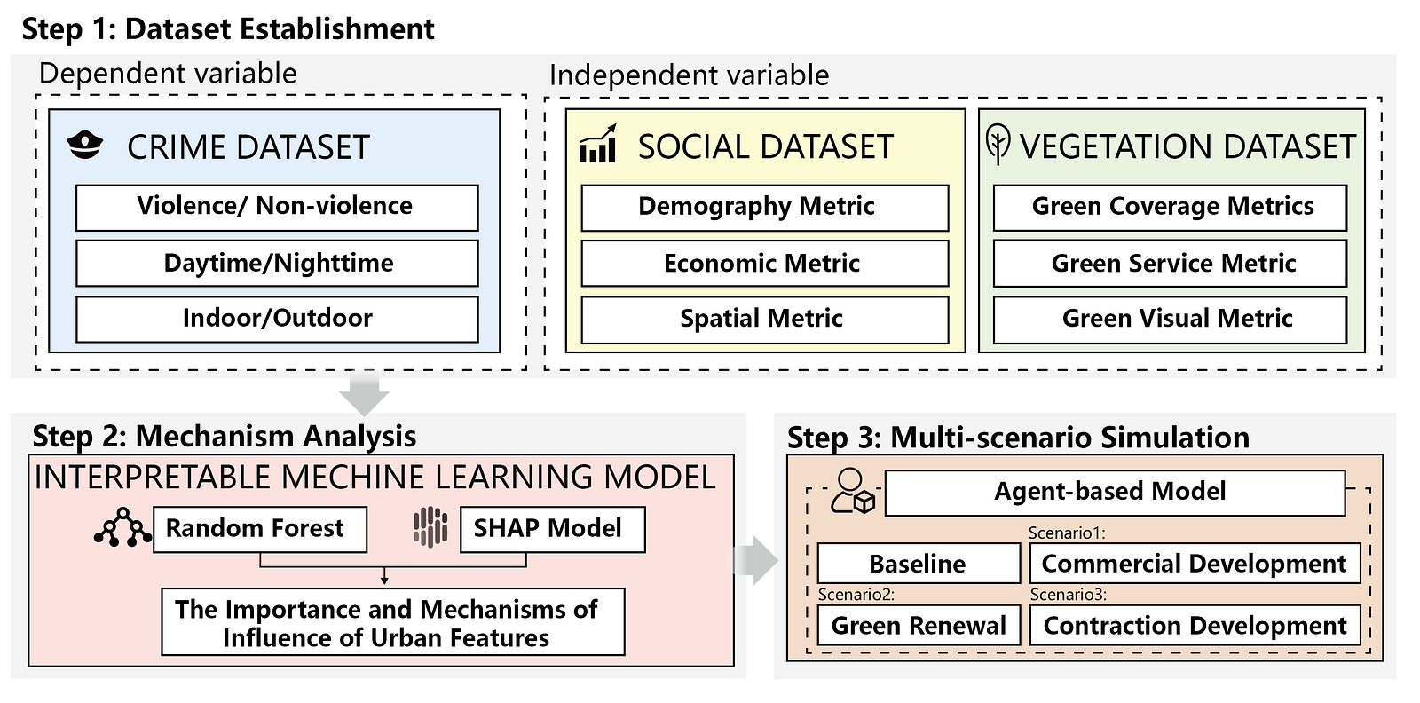 Urban environmental safety is critical for sustainable city development, yet the complex mechanisms underlying crime patterns pose significant research challenges. This study analyzes 12,893 criminal judgments (PCJs) from three Chinese megacities over three years using Large Language Models (LLM), developing a crime pattern simulation model that integrates Interpretable Machine Learning (IML) with Agent-Based Modeling (ABM). Then, three urban renewal scenarios were tested. The result shows that: (1) Socioeconomic and built-environment factors account for 33.3%-44.5% of outdoor crime spatial variation; (2) Nighttime lighting emerges as a key predictor, while canopy cover exhibits threshold effects on specific crime types; (3) Green regeneration scenarios demonstrate significantly lower crime rates. The proposed multidimensional framework provides actionable spatial planning insights and policy recommendations for safer cities.